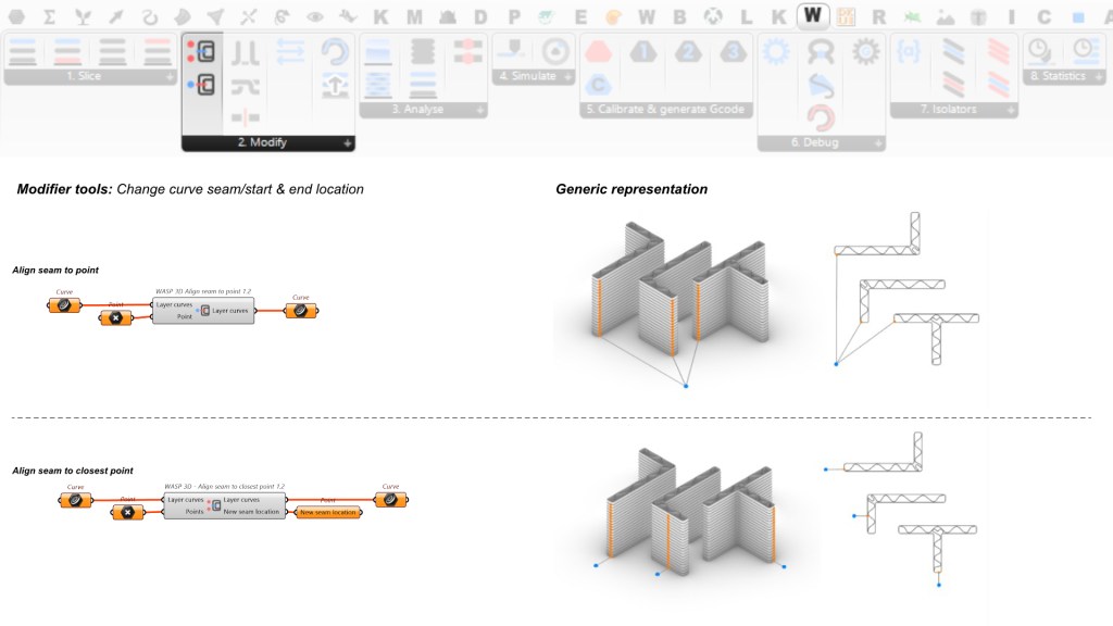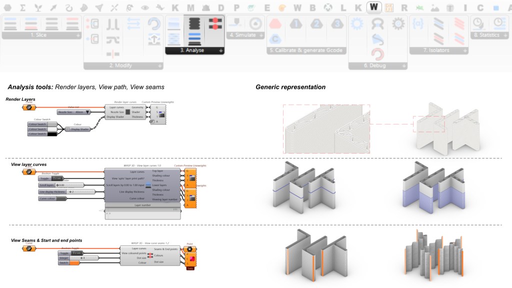 The plugin includes a comprehensive design-to-production toolkit, including slicing options, seam location and seam type control, as well as a range of toolpath modification and analytical tools tailored to the WASP crane.