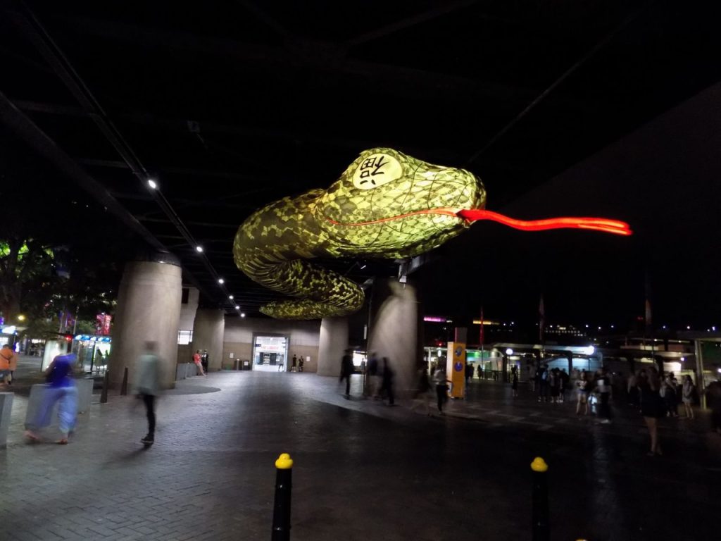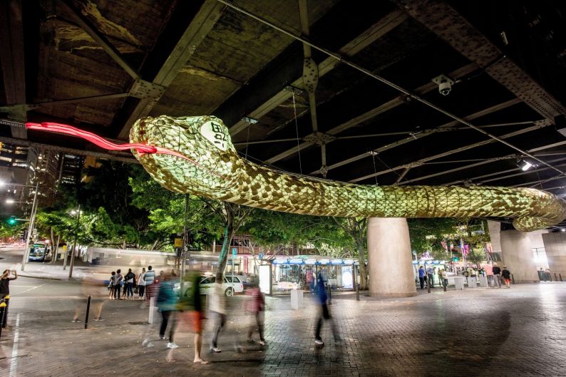 The Lunar New Year Snake was developed at Amigo&Amigo for Vivid Lighting festival Sydney. The installation plays on the traditional art of Chinese kite-making and also features the Chinese happiness symbols in the eyes, as a symbol of good fortune for the coming year. Internal LED lights slowly alternate from dark to bright interacting with the woven mesh scales giving the snake a playful and light personality. Suspended in Circular Quay, as the public makes the walk from the train station to the opera house the Snake is an entry marker to Vivid festival where families can meet and get a sense of what’s to come.