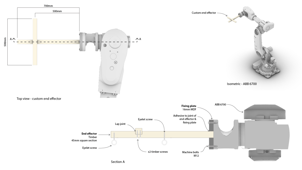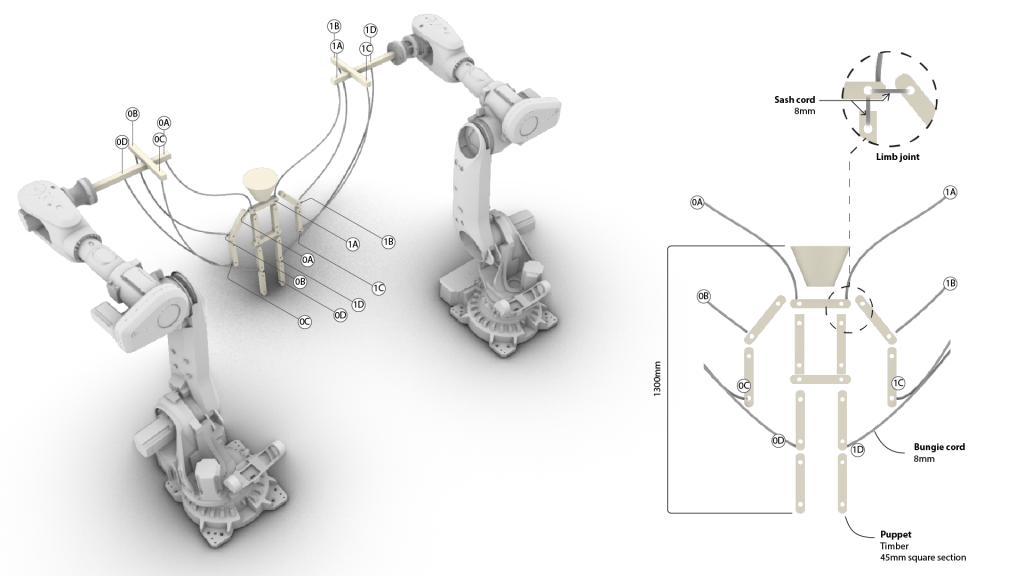 The end effector was designed from 40mm square section of timber with a lap joint at the cross section. The puppet was made from the same timber and connected to the end effector with elastic cord.