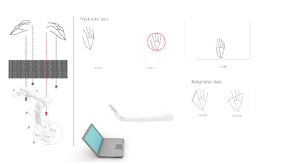 With the participants located behind the robots and after some simulated tests it made sense for the participants hand positions to manipulate the robots axis as shown in the image below: