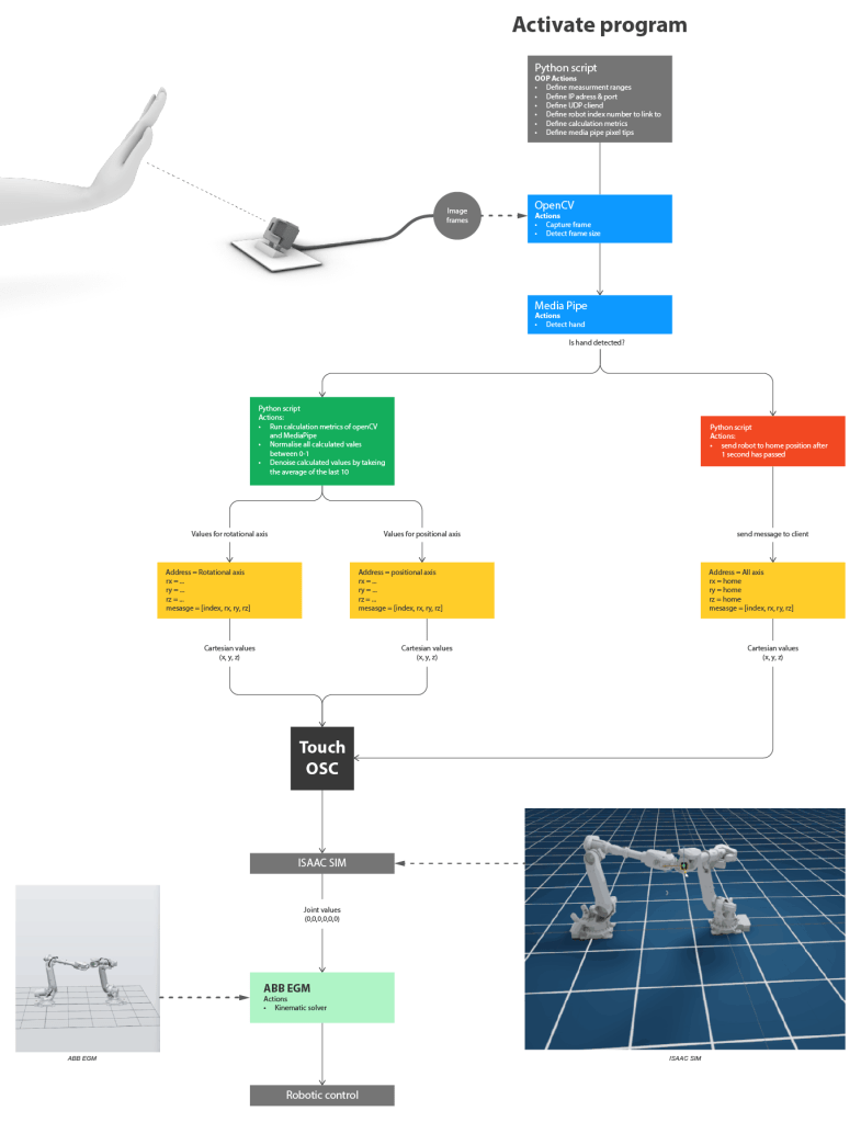 To make this process of interaction possible we developed a python script that incorporated the libraries of openCV and media-pipe to obtain a digital skeleton of the participants hand. From there we were able to compute the positions of the hand and fingers, and then couple this data to a specific axis of the robot before publishing it to ISAAC SIM.